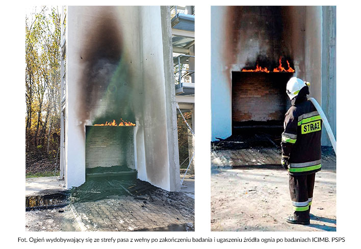 - pas z wełny, w strefie nadproża, który miał pełnić rolę „bariery ogniowej”, utrzymywał ogień na całej szerokości jeszcze przez pół godziny od ugaszenia stosu stanowiącego źródło ognia i wymagał ugaszenia w związku z koniecznością zakończenia obserwacji (tzw. „efekt knota”).
